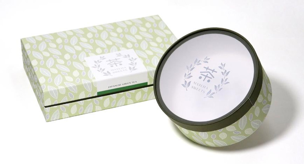 抹茶スイーツの風味と世界観を、インロー型とサークル型の2種のBOXで表現した事例です。丸型BOXは天面にフロスト素材を用いて、内容物をほのかに透かし見せる演出を施し、視覚的な楽しさも加えています。落ち着いたグリーンの差し色とリーフ柄のデザインで、抹茶の深みや自然のイメージを強調したパッケージです。
